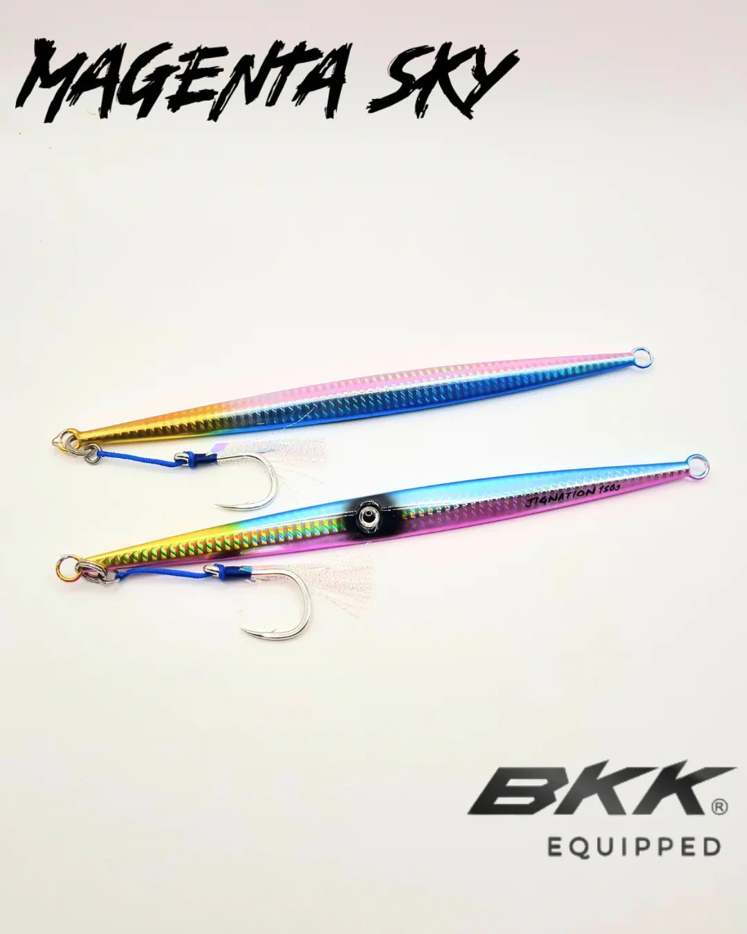 Jignation Depth Hunter Gen.2 jigs are the latest in our range now stronger than ever. Upgraded LED strength these will not buckle. Higher quality pastel paint making them more bite resistant. They are a slim tall design that torpedo straight to the depths and cut through the water fast on retrieval. Best worked with a fast mechanical jigging action, with there bright colours and a reflective underlay they are great for chasing pelagics and other reef species. The kingfish love these jigs as do many other pelagics, ready to roll right from the packet rigged with BKK 8062 hook, be sure to have a variety of them in your jig wallet.